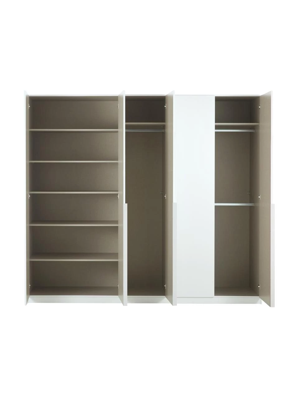 Der Drehtürenschrank von rauch ist eine tolle Stauraumlösung für das Schlafzimmer. Der Kleiderschrank überzeugt mit einem modernen puristischen Design. Lange Griffleisten mit einer angenehmen Haptik und praktischer Handhabung beim Öffnen und Schließen der Drehtüren runden die Optik gekonnt ab. Im Inneren begeistert der Schrank mit seinem Stauraumkonzept: Hinter den Drehtüren befinden sich 3 Kleiderstangen sowie 7 Einlegeböden, die individuell nach Ihren Wünschen angebracht werden können. Sind alle Drehtüren geöffnet, haben Sie Ihren gesamten Schrankinhalt im Blick und somit eine komplette Übersicht über Ihre Garderobe.