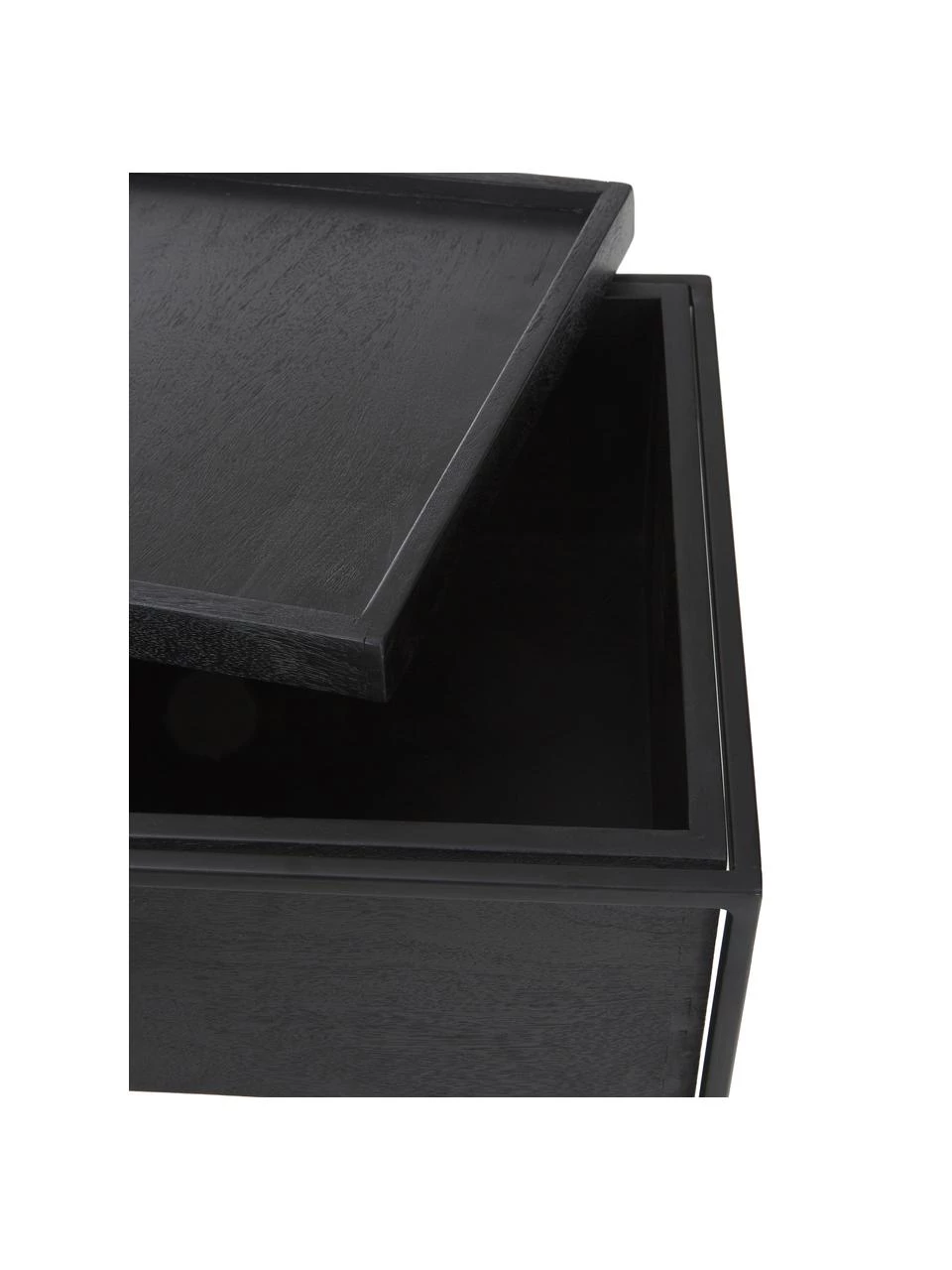 Heißt: Robustes Mangoholz und geradelininges, pulverbeschichtetes Metall. Durch die abnehmbare Tischplatte kann der Innenraum des Tisches als Stauraum genutzt werden. Stylishes Industrial-Design, perfekt zum Präsentieren und Verstauen.